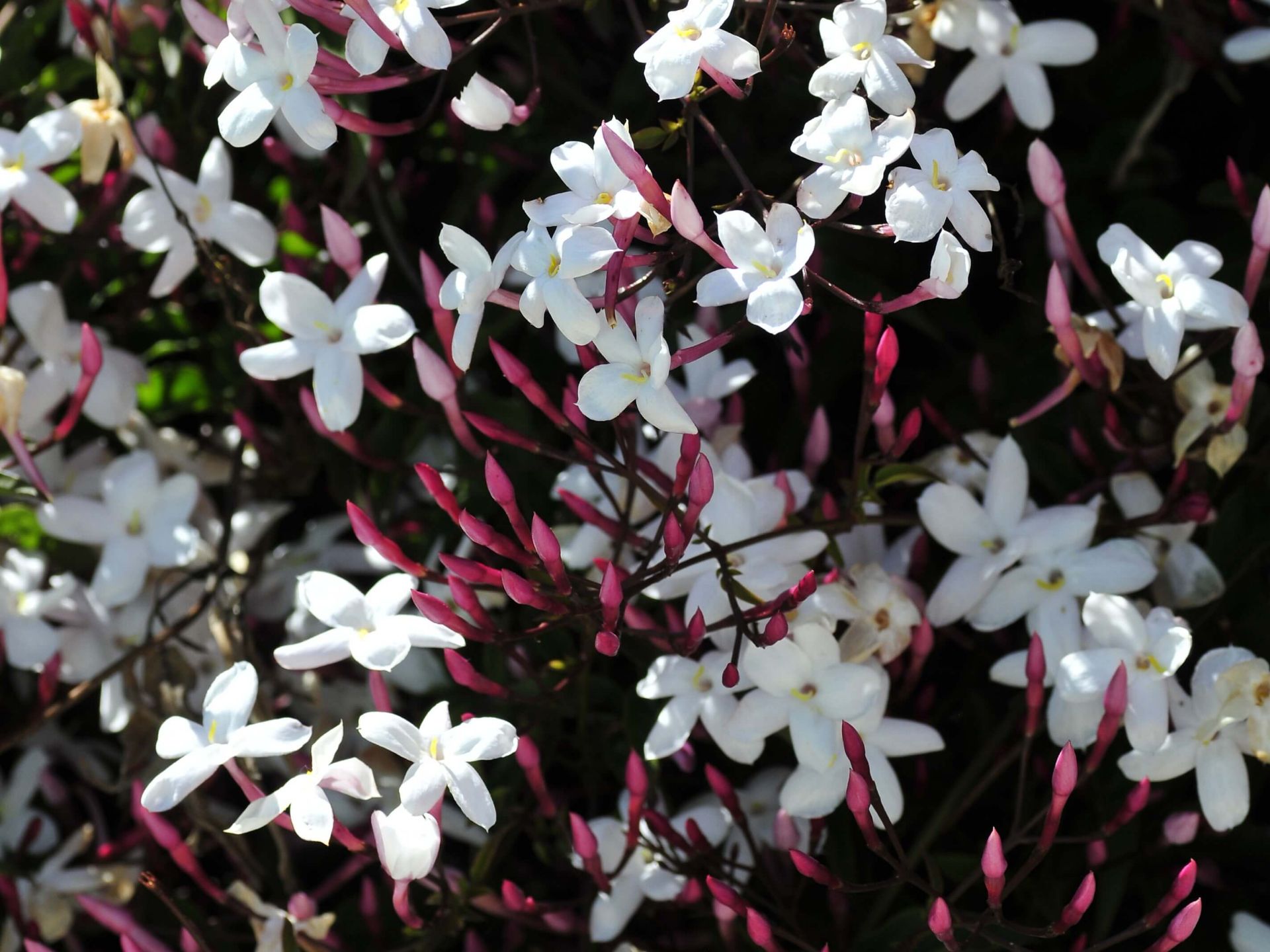Star Jasmine is a vigorous evergreen twining vine known for its dark green, glossy foliage and large clusters of heavily fragrant white star-shaped flowers. These flowers emerge from pink buds and bloom throughout most of the year, filling the air with a sweet fragrance.
